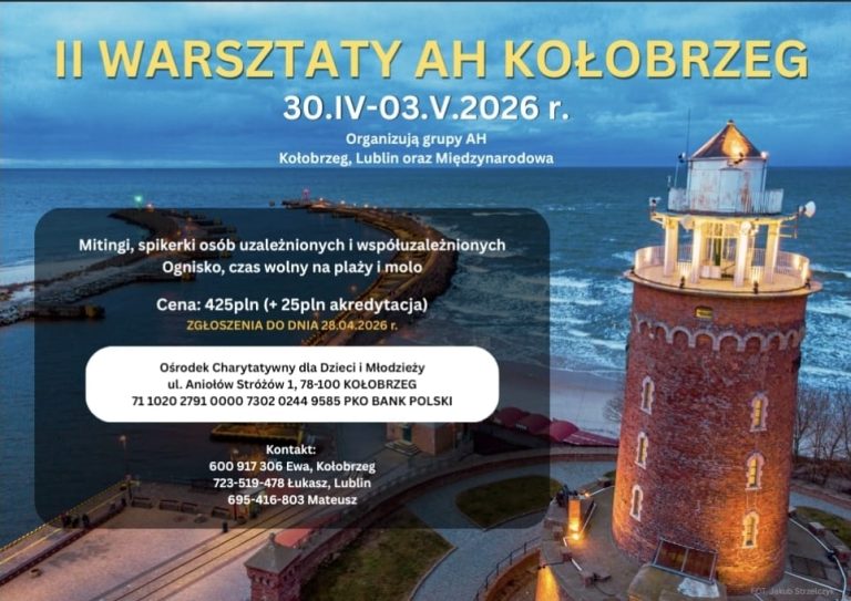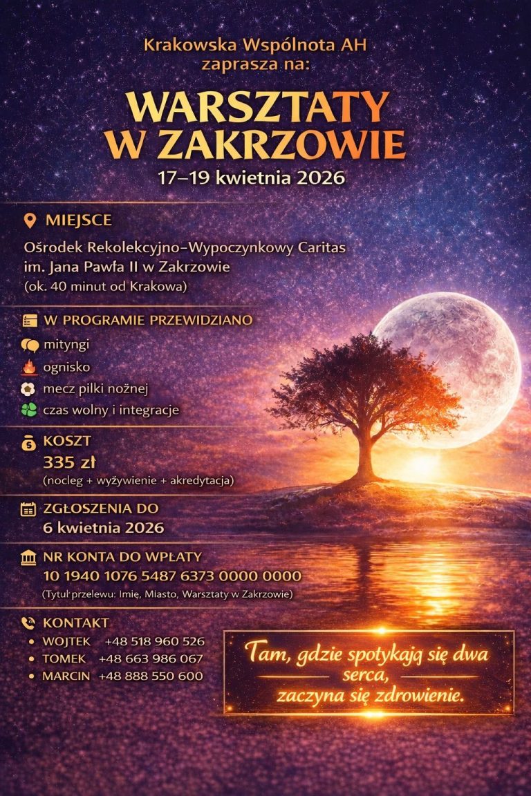 Warsztaty AH w Zakrzowie odbędą się w dniach 17 – 19 kwietnia 2026 roku. Weekend pełen zdrowienia, zabawy i integacji. Zapraszamy serdecznie!