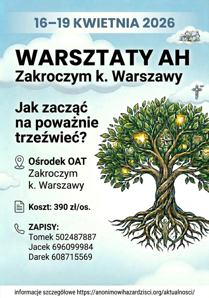 Warsztaty AH Zakroczym k. Warszawy odbędą się w dniach 16–19 kwietnia 2026 roku. Główny temat warsztatów: Jak zacząć na poważnie trzeźwieć?